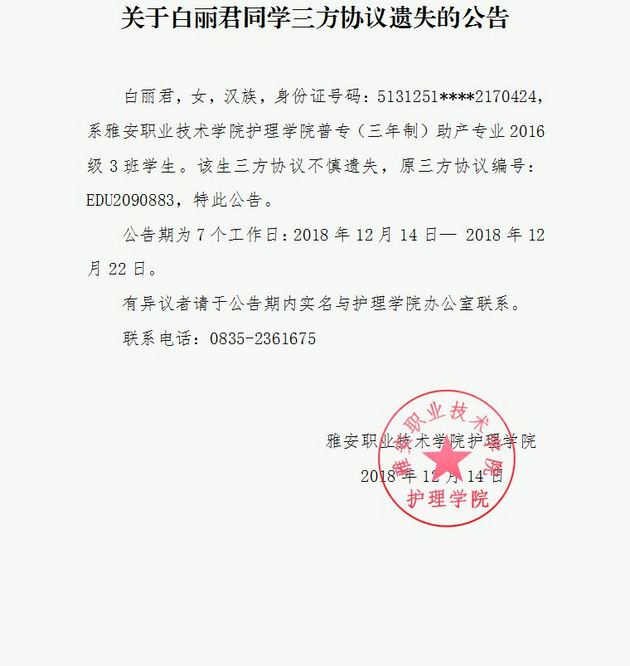 关于白丽君同学三方协议遗失的公告