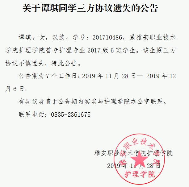关于谭琪同学三方协议遗失的公告