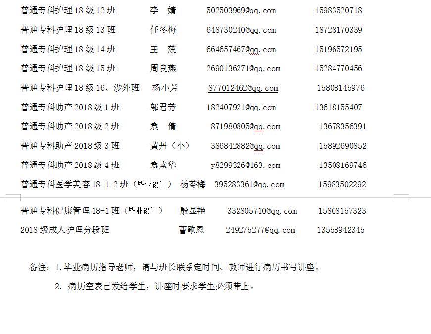 1.2020年12月30日以前员工将写好的护理病历、毕业设计(word格式)电子文档发到指导老师的邮箱(邮件主题要写清楚班级和姓名,以便老师查找),提交后电话或短信通知指导老师。