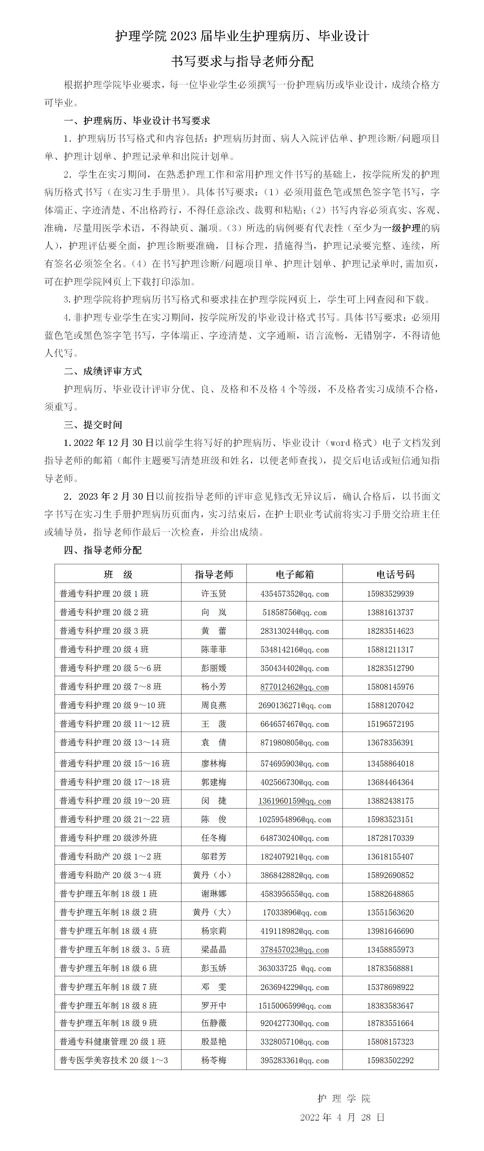 2023届毕业护理病历书写要求与指导老师分配