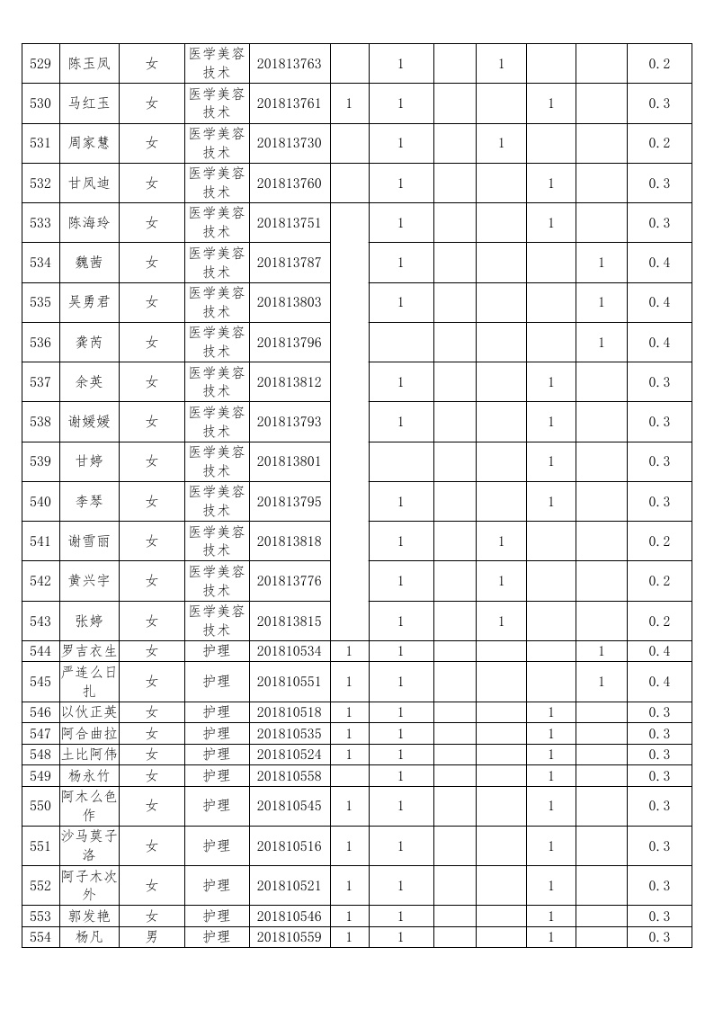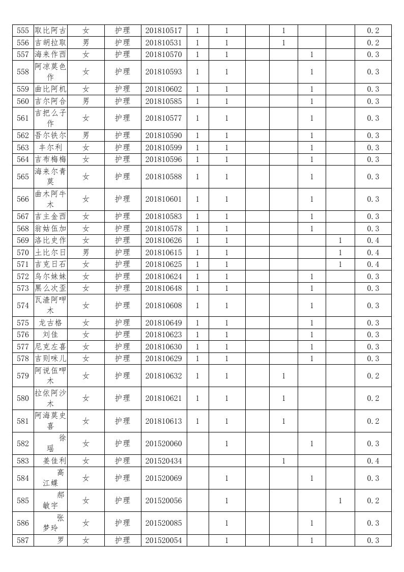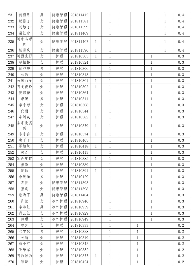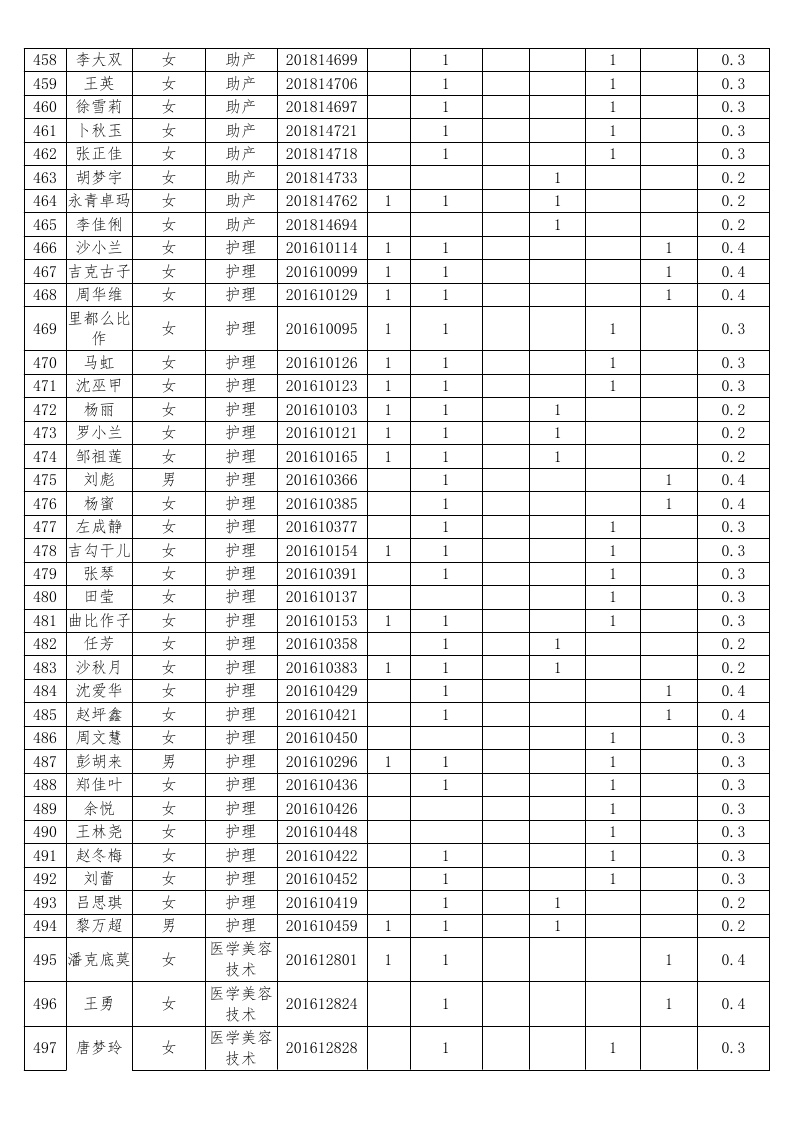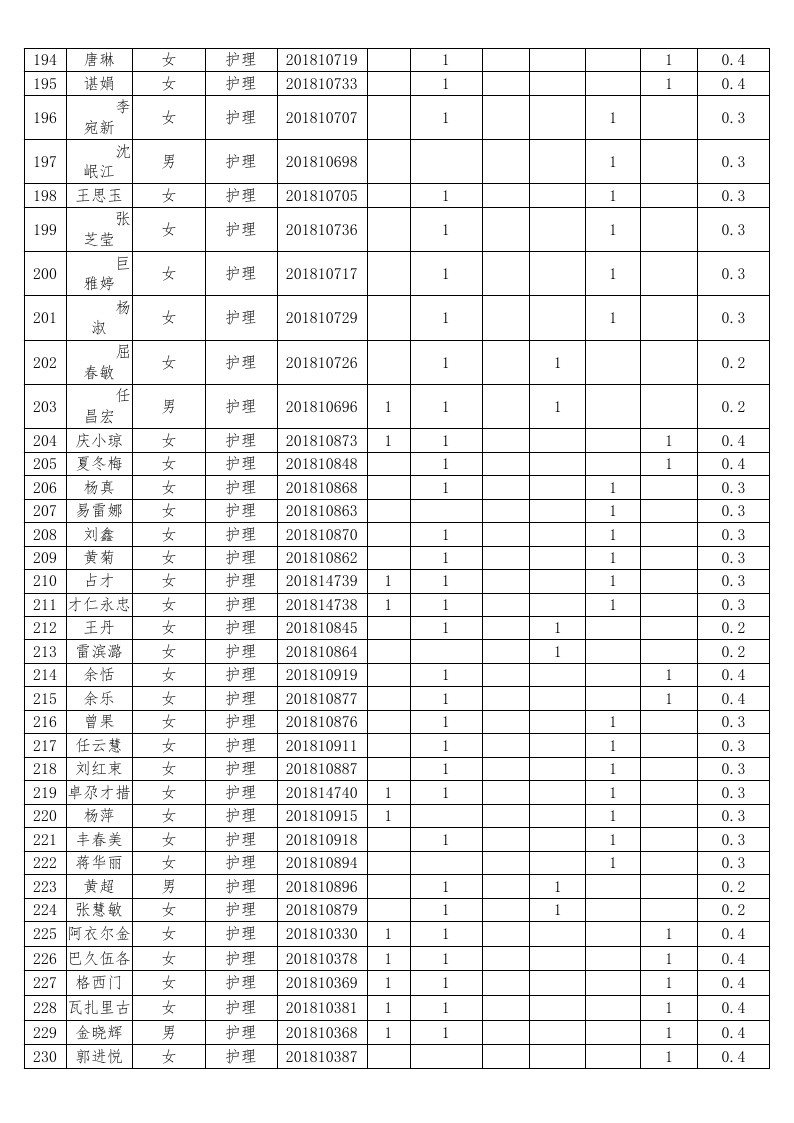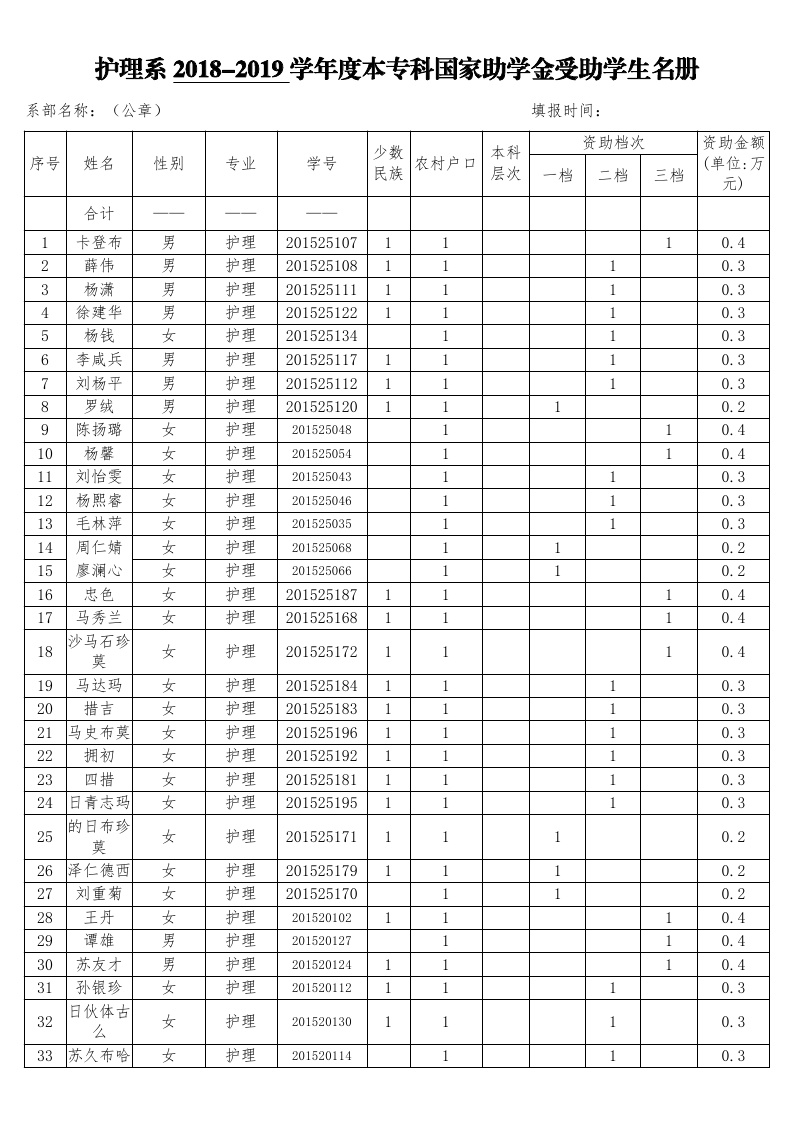 护理系2018-2019学年度本专科国家助学金受助员工名单公示汇总表