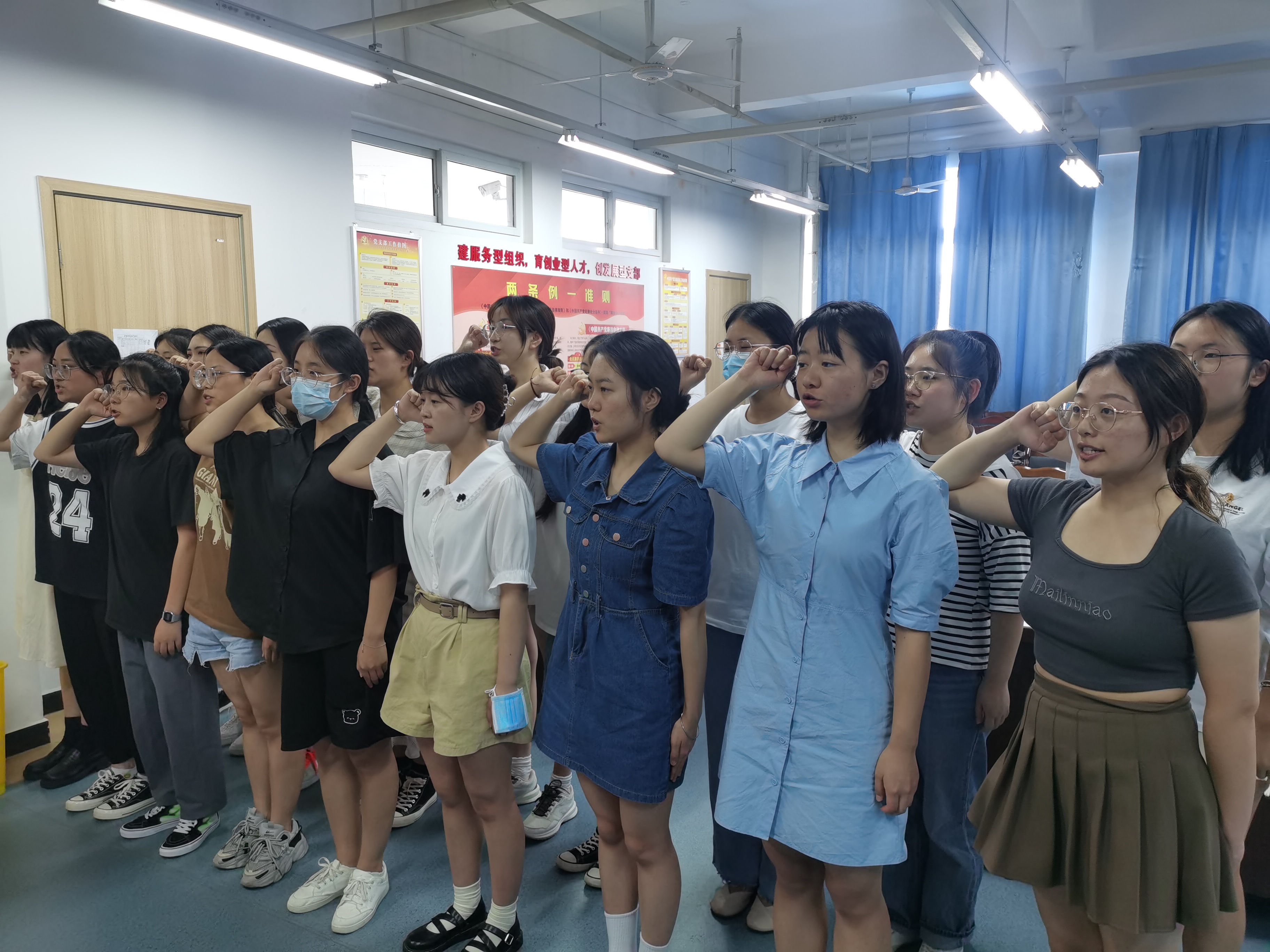 21名新党员,面向党旗、举起右拳,庄严宣誓。铿锵有力的宣誓声,表达了同学们对党的忠诚和为共产主义事业奋斗终身的决心。