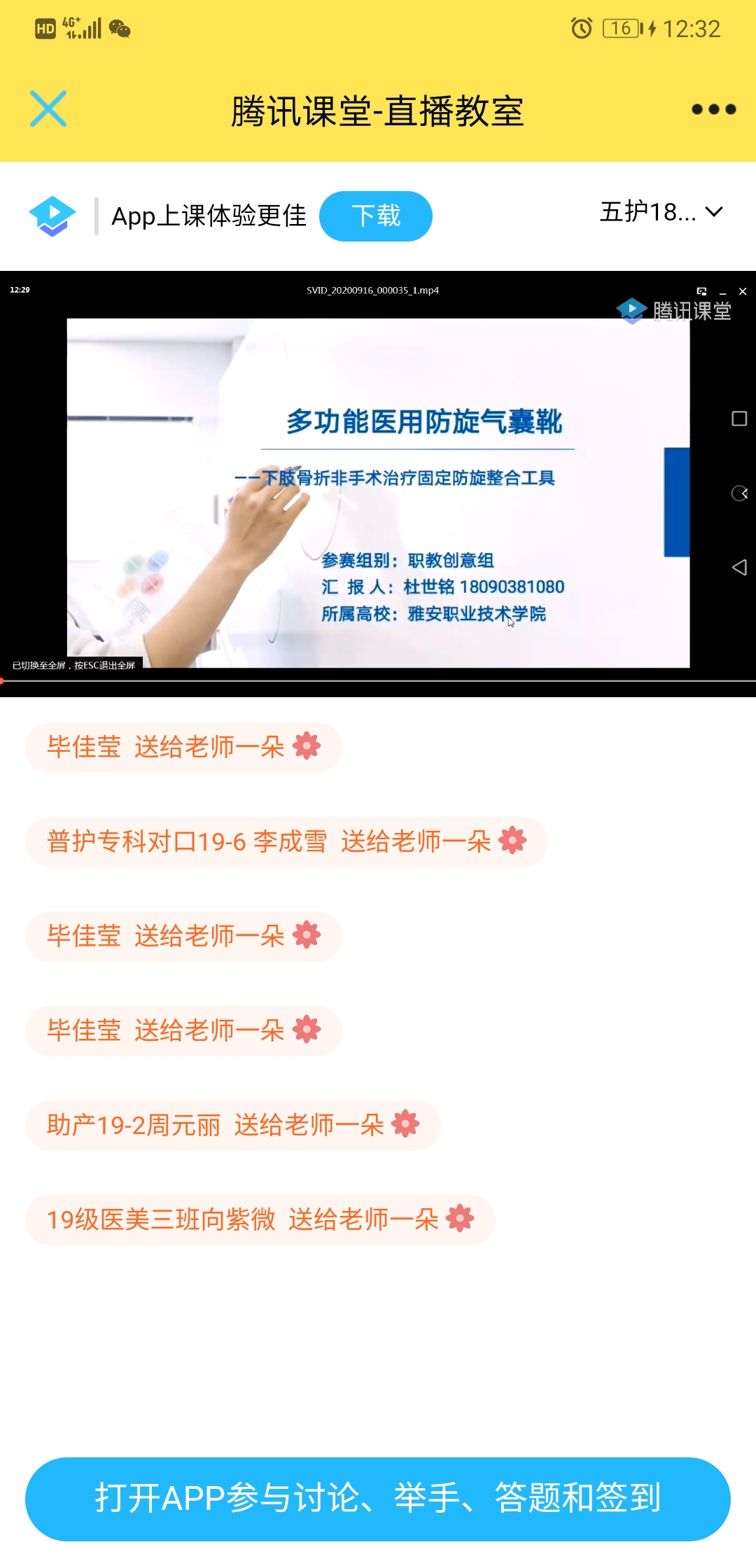 活动中,本年度四川省“”挑战杯”老员工创新创业计划大赛金奖项目“多功能医用防旋气囊靴”、中国创翼四川赛区决赛项目“龙霖校园”及互联网+创新创业大赛校赛优秀项目代表进行了分享。三位团队负责人从项目筛选、团队组建、参赛经验及存在不足等方面和同学们进行了深入交流和分享,并就大家提出的问题一一进行解答。叶芋伶结合本学年创新创业工作取得的成绩和努力方向进行总结,并对同学们提出期望:希望大家在学习知识、提升技能的同时积极参加各类创新创业实践活动,勇于锻炼自己的创新思维和创业能力,用积极的心态去面对学习、生活中的困难和问题,迎难而上,用自己的聪明才智去破解难题,从中体会创新创业教育的价值和意义,收获成长。