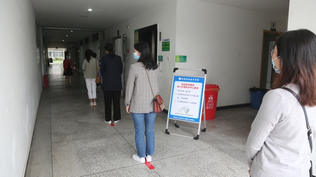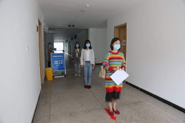 会后,教师到现场进行演练,主要由教师志愿者模拟员工,熟悉进出实训室要求,上课路线,教师均佩戴口罩、做好自我防护,沿地标标识间隔一米排队,按照提示路牌依次进出实训室,统一入口与出口,减少交叉感染机会。