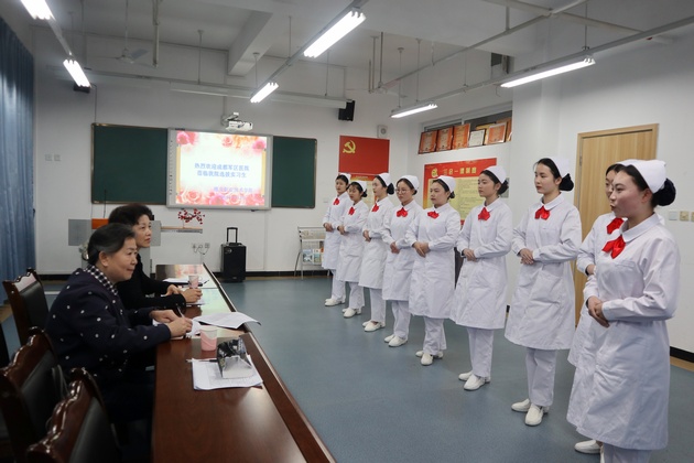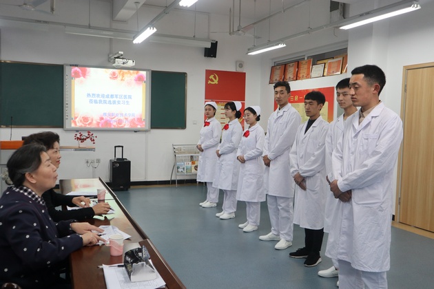 4月3日,四川省成都军区总医院主任护师王英和总护士长熊碧君莅临公司选拔护理专业实习生,面试工作在青年路校区实训楼607进行,共有144名同学参与选拔。