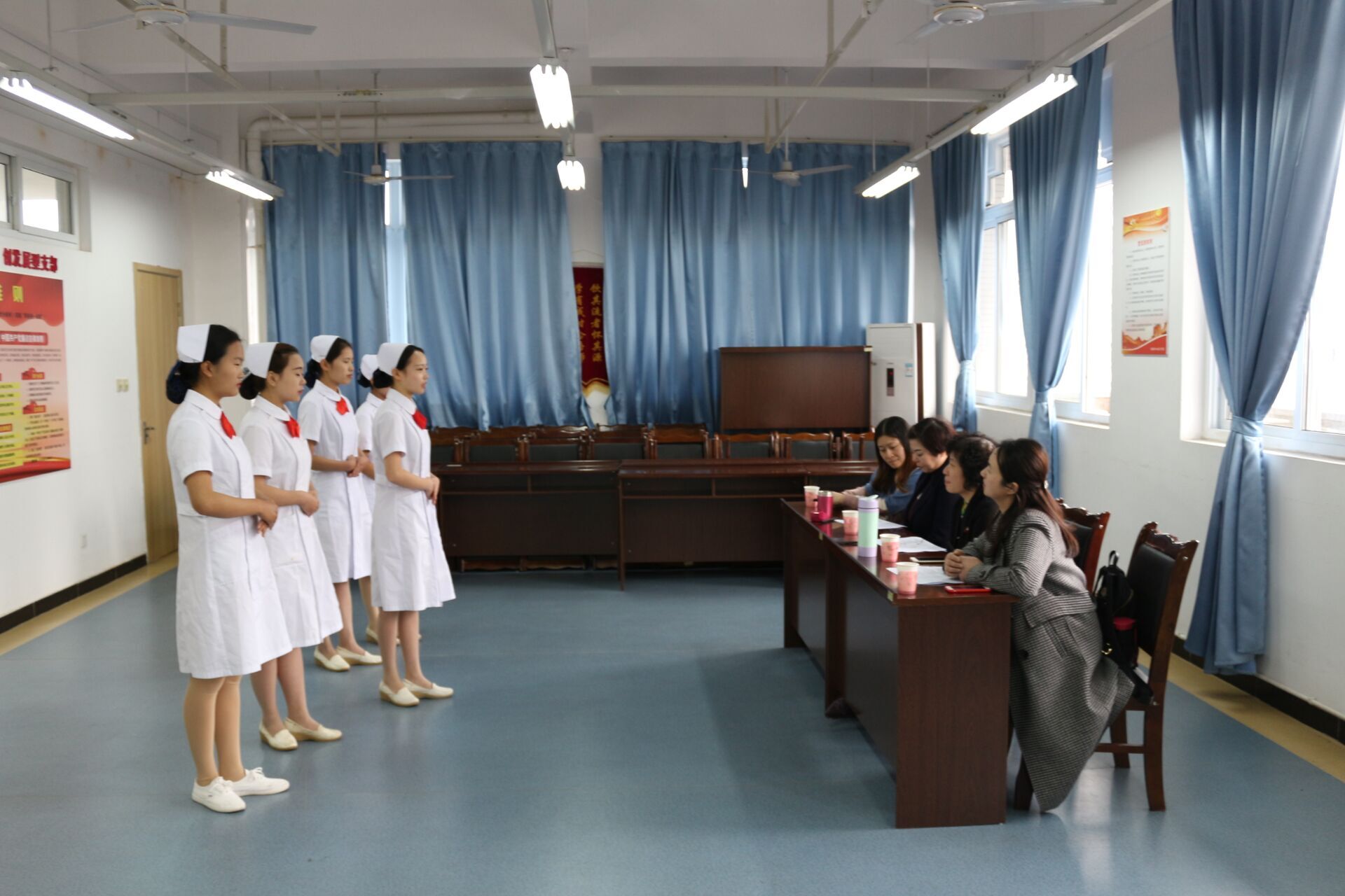 本次面试共有43名同学报名参加,面试以5人一组入场的形式进行。同学们先依次进行自我介绍,面试官再针对员工专业、实践经验和如何处理人际关系等方面进行提问。在紧张的气氛中同学们镇定沉稳,并突出展现了自身的特长与优势,以最好的状态接受面试官的提问,受到了面试官的一致好评。最终二十余位同学将进入该院实习。