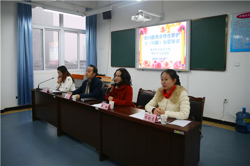 1月18日上午,公司与雅安市人民医院2016年医校合作在职护士分层培训开班仪式在青年路校区实训楼607隆重举行。公司党委书记张大凯、雅职院附属医院护理部主任冯贤萍,雅安市人民医院护理部副主任周昀霞、护理系相关负责人以及公司附属医院和市人民医院N3级别的34名护士参加了开班仪式。护理系主任王静主持开班仪式。