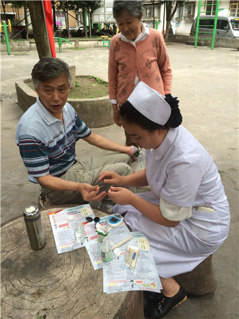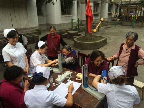 2015年5月26日下午,护理系青志协的南丁格尔志愿者们在上坝路社区绿洲路36号大院开展了“健康进社区”的义诊活动。