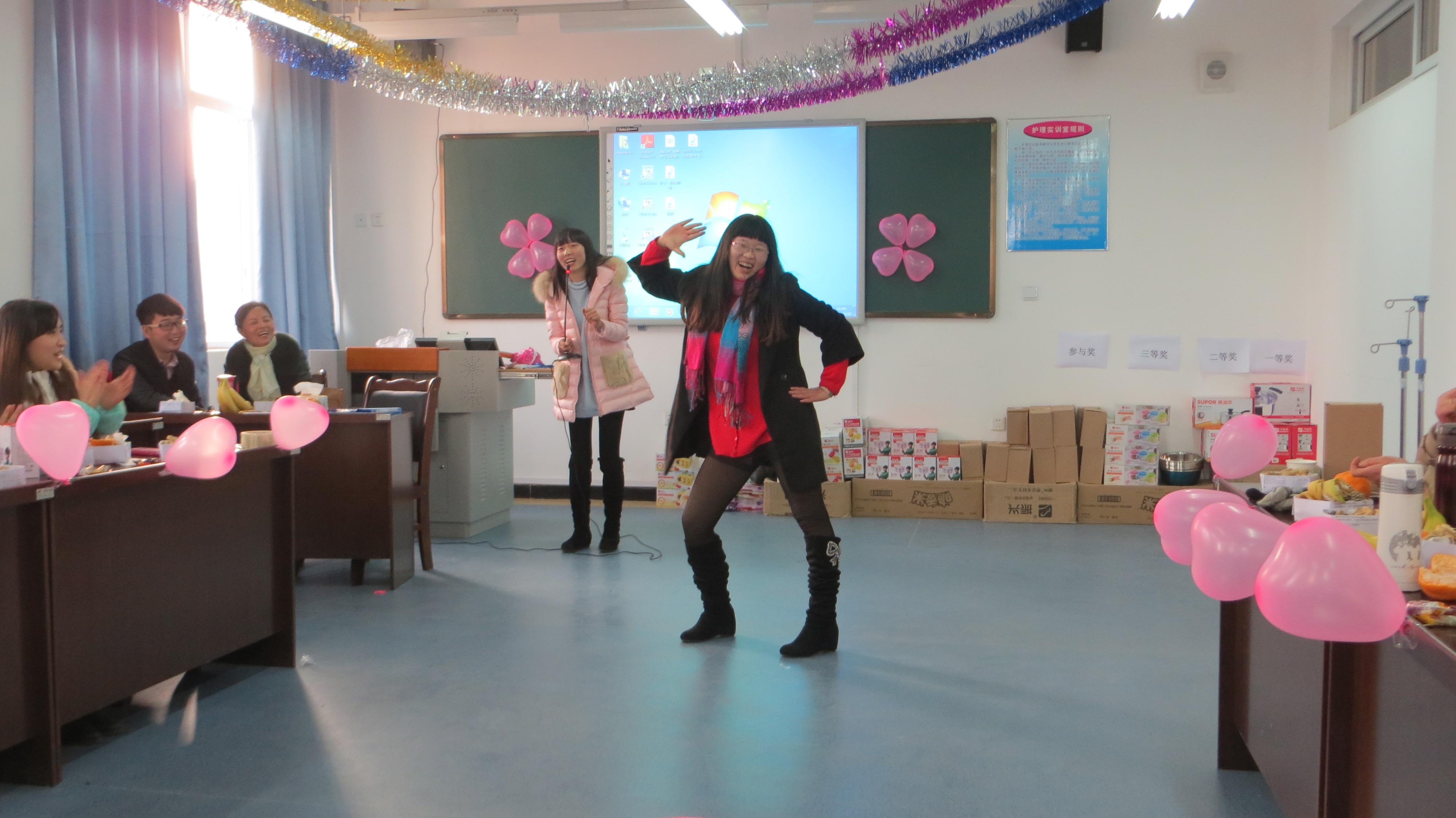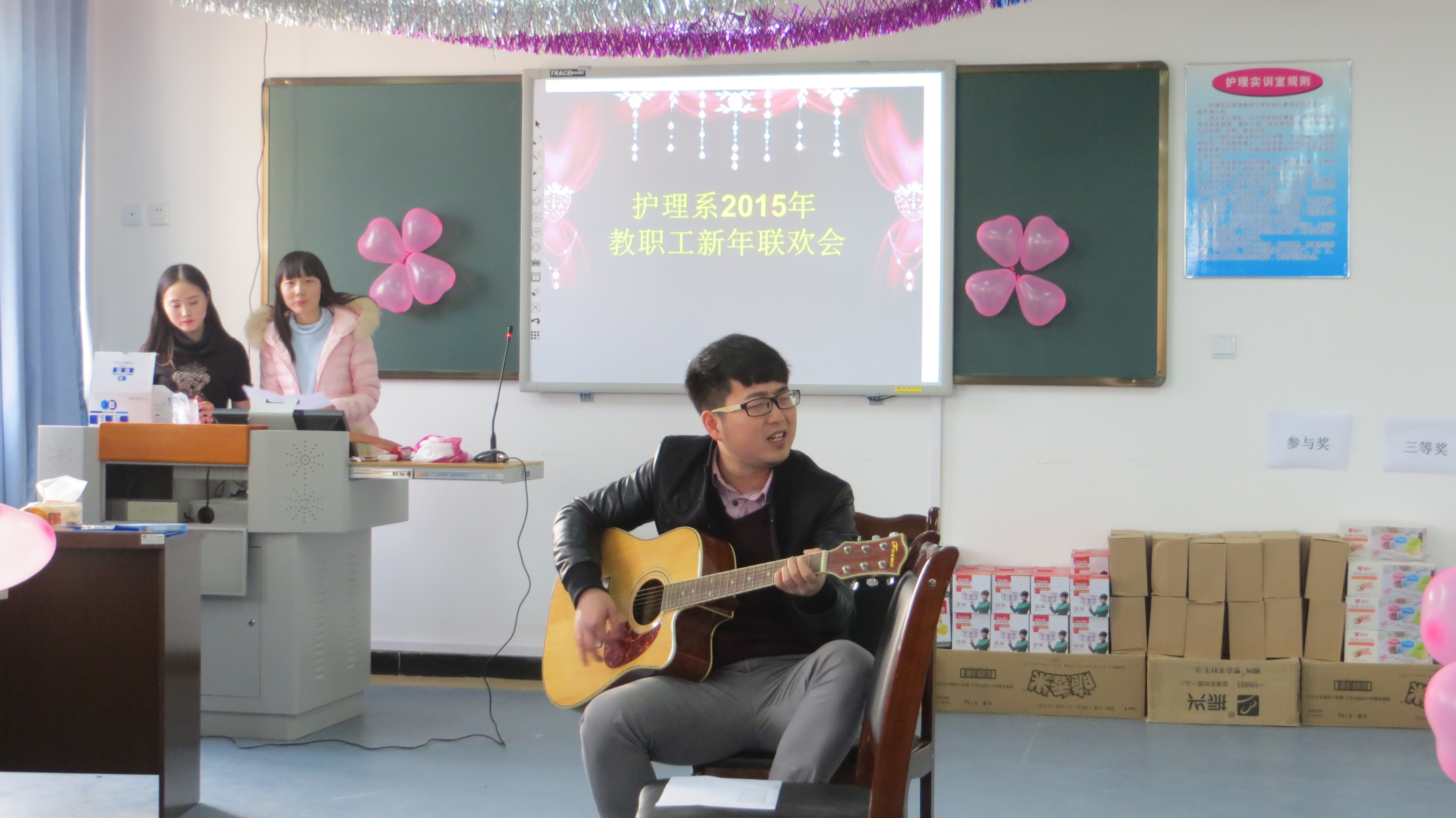 为展示教职工的活力与风采,增强全系凝聚力,12月30日下午护理系2015年教职工新年联欢会在青年路校区实验实训大楼607隆重举行,全系教职员工相聚在一起共同庆祝新年的到来。联欢会由谢琳娜、闵捷两位老师主持。联欢会上,系主任王静、党支部书记郭英才对全系教职工的付出和辛勤劳动表示感谢,回顾了2014年系部取得的成绩,提出了对2015年的美好憧憬。