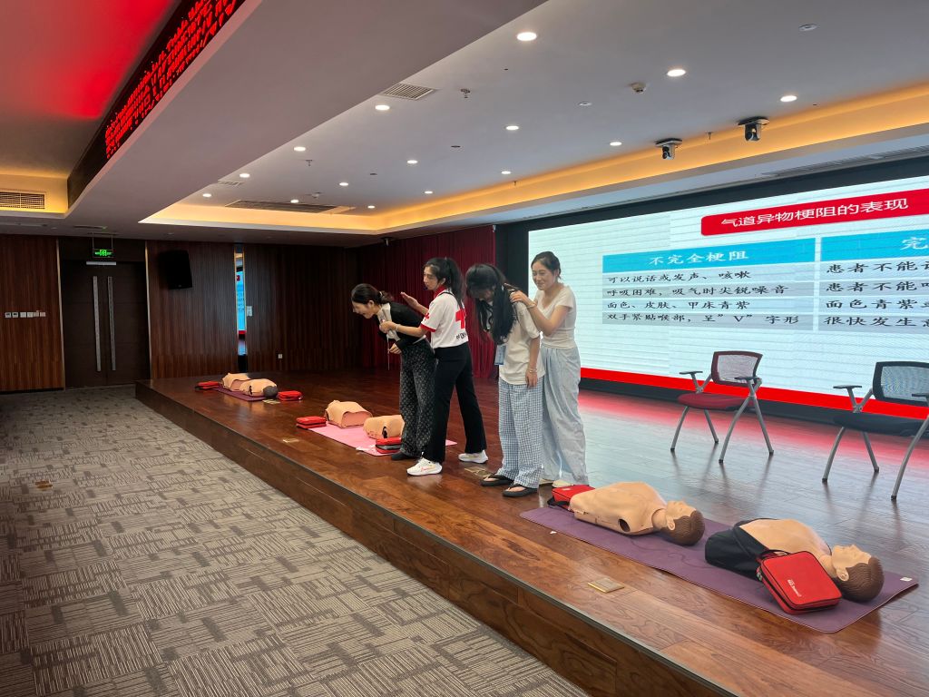 公司中国红十字会救护培训师黄丹和伍静薇老师主讲,普及红十字运动知识、现场救护和心肺复苏等基本知识,演示了心肺复苏、AED使用、气道异物梗阻的急救程序和操作技术。现场学员积极参加学习,老师手把手讲解胸外按压技巧、AED使用、气道异物梗阻等急救技术。