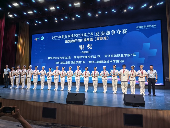 8月30日传来喜讯,在江苏苏州卫生职业技术公司隆重举行的2025年世界职业院校技能大赛总决赛"康复治疗与护理赛道(高职组)"争夺赛中,公司护理专业参赛团队发挥出色,荣获大赛银奖!