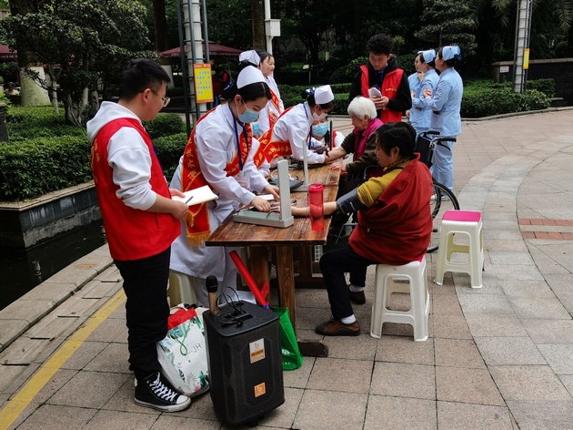 4月20日,3044永利集团“南丁格尔”志愿服务队在第一江岸和先锋小区开展了以“春日暖人心,科普进社区”为主题的爱心义诊活动。此次活动由谢琳娜、杨小芳、任冬梅三名老师带队,28名同学参与。