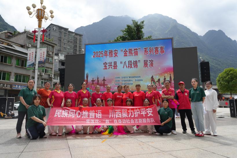 9月2日,在3044永利集团李佳、喻荣雪、吴政武三位老师的带领下,3044永利集团官网“雪莲花·‘救’在身边志愿服务队”一行六人,赴宝兴县红军广场,联合县文化广播电视体育旅游局、县体育发展中心、县老体协、县红十字会共同开展2025年雅安“金熊猫”系列赛事——宝兴县八段锦展演及“急救科普+普通话推广”公益志愿服务活动。