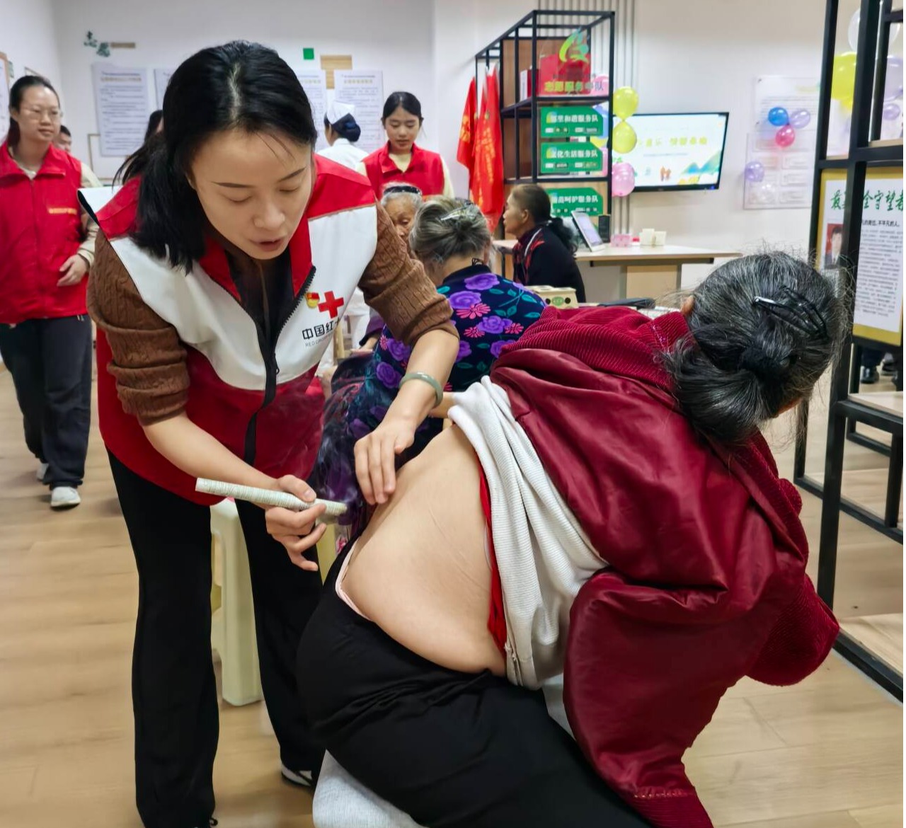 在雨城区石马社区,教师杨苓梅、吴政武和志愿者同学一起为有需要的老年人做了艾灸,点燃艾条,然后在对应穴位上艾灸,配合用按摩的方式为老年人温通经脉。