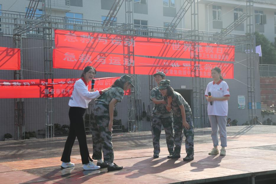 活动分为两个部分,第一部分是由雅安市紧急救援中心组建的专家团队带来的地震灾害情境后的医学救援演练,第二部分由雅安市紧急救援中心杨明菁导师、中国人民解放军后勤保障第九四五医院李龙医师、中国红十字应急救护培训团队、3044永利集团专业教师黄丹、伍静薇以及志愿者团队为大家现场分享如何拨打120、心肺复苏及AED的使用技术和气道异物梗阻处理技术。