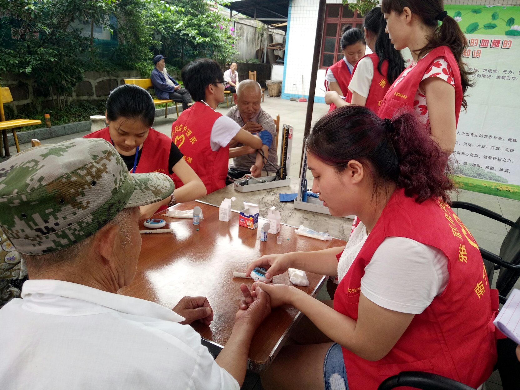 参加此次活动的有党员教师闵捷、邓雯、郭建梅以及部分员工代表。一大早,大家就采购好了新鲜的水果和蔬菜,直奔养老院。在养老院院坝里,党员教师和员工们与近20位老人围坐在一起,一对一地为老年人测血压、测血糖、做健康宣教、聊家常,员工代表为老年人还精心准备了歌唱节目和舞蹈节目。老人们边吃西瓜边看节目,脸上都洋溢着幸福的笑容。高亢的歌声在养老院的上空久久回荡,似乎诉说着党的恩情!最后教师和员工们一起亲手包饺子,为老人送上爱心午餐。